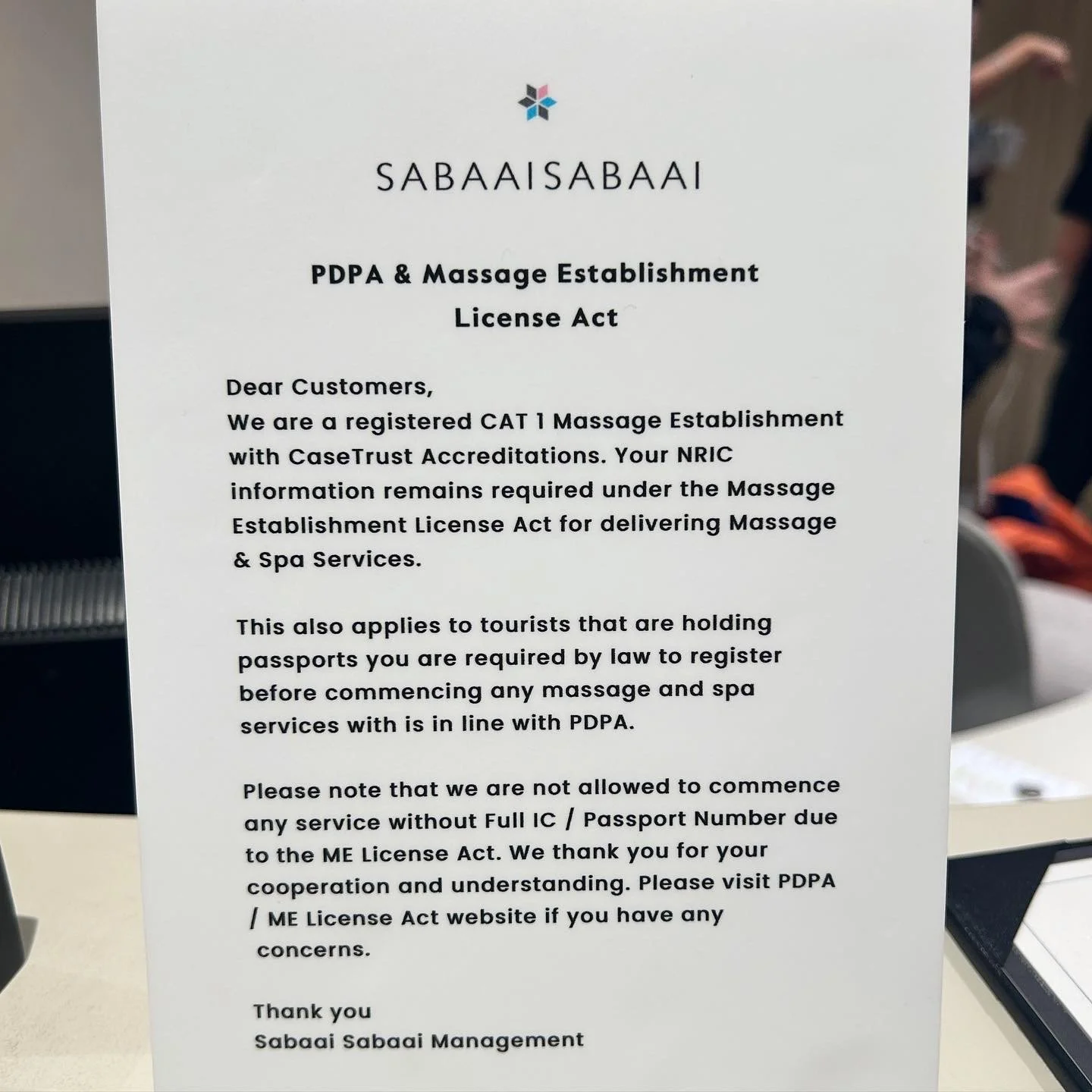 Just a reminder to all customers that it is compulsory by law that all license massage establishment in Singapore (CAT1) have to get customers to fill up health declaration form (Casetrust Requirement) and full personal details such as full name and Identity card numbers or passport numbers for tourist (for license requirement) Without the details keyed in properly we are not allowed to serve the customers. This requirement is covered by PDPA you can find out more details on their website: https://www.pdpc.gov.sg/-/media/Files/PDPC/PDF-Files/Advisory-Guidelines/Advisory-Guidelines-for-NRIC-Numbers---310818.pdf